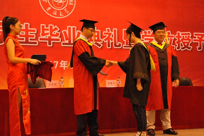 毕业典礼在庄严的国歌中正式开始。首先,王忠恕副经理宣读了《2017届本科生毕业和授予学位的决定》。随后,宋传学经理、王忠恕副经理为每位毕业生执行拨穗礼、授予学位证书,并与员工一一握手、合影。四百余次握手、四百余次转身,老师的每一个动作都向学子们传递着力量、信念和温暖。在校生代表黄晨光、毕业生代表仲帅和教师代表汽车工程系朱冰教授的讲话激起了一阵阵热烈的掌声。