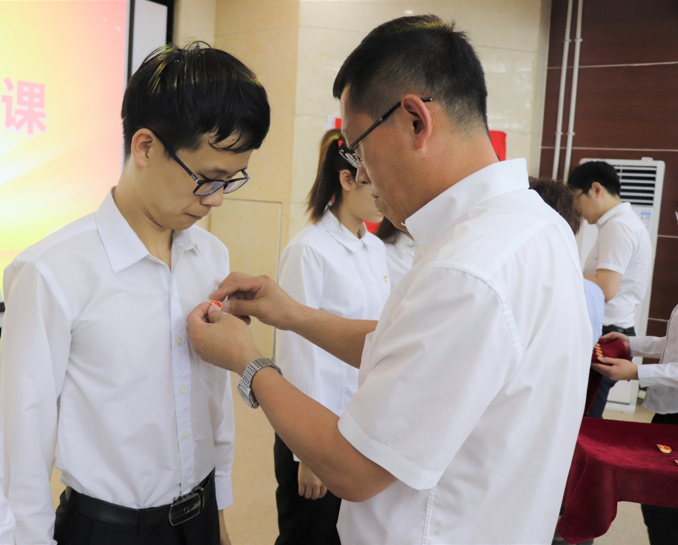 会上,吴昊老师宣读了2019年上半年发展党员名单。参会的公司领导老师为预备党员佩戴党员徽章。在团委书记吕博群老师的领誓下,新党员面对鲜红的党旗、举起右拳进行了庄严宣誓,郑重地许下了入党誓词。庄严有力的誓词深深触动和震撼着预备党员的心灵,预备党员赵路洋同志说:“今天宣誓正式加入党组织,既是人生新的起点,更是新的责任与担当。”