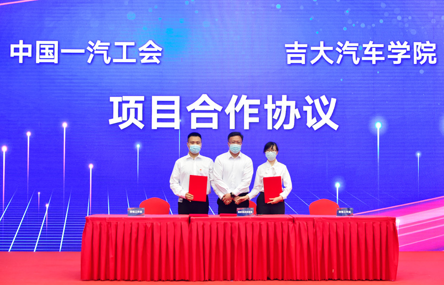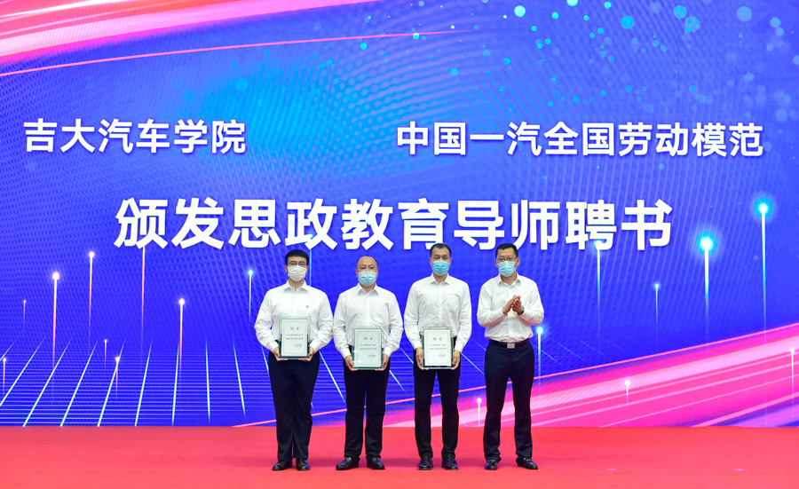 会上,高振海经理代表公司签署了项目合作协议,李善兴书记代表公司向全国劳模李凯军、齐嵩宇和吉林省特等劳模金涛颁发了“思政教育导师”聘书。双方今后将在老员工思想政治教育、青年思想引领、劳模精神传承、老员工生产实习与毕业设计、一汽集团职工生产创新成果理论转化与研发、工会协同联络机制等方面开展深入合作。