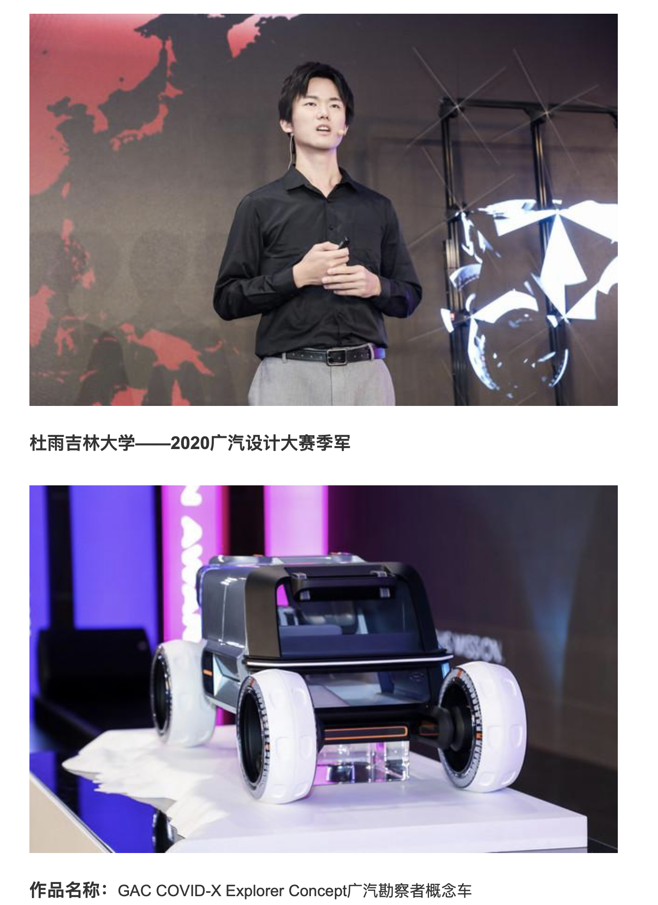 广汽设计大赛是国内影响力最大的员工汽车设计比赛之一。今年大赛的题目为《后疫情时代下的生活新范式》,收到来自全球各大高校百余名选手的投稿,最终只有8位选手入选决算阶段。在决赛阶段,选手们在广汽研究院进行为期4个月的实习,经过不断的完善作品,层层选拔,最后制作实体模型。杜雨同学最终以第三名的成绩完赛。