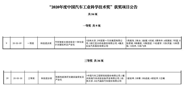 近日,2020年度中国汽车工业科学技术奖颁奖典礼于上海隆重举行。本年度共有54个项目获奖,其中特等奖1项、一等奖9项、二等奖10项、三等奖34项。