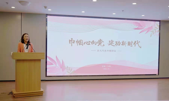 喜逢建党100周年,为深入贯彻落实习近平总书记重要讲话精神和全国妇联七部委联合发布的《关于实施科技创新巾帼行动的意见》精神,响应公司妇委会2021年度“妇女小家一家一品”基层活动号召,韦德1946体育官方入口妇委会于10月8日举办了“巾帼心向党,建功新时代”—吉大汽车巾帼讲坛活动。公司妇委会主任苗艺璇、副主任焦红兵、公司党委书记黄忠华、副书记胡忠巍出席了活动。讲坛由公司副经理、妇委会主任林海兰主持。
