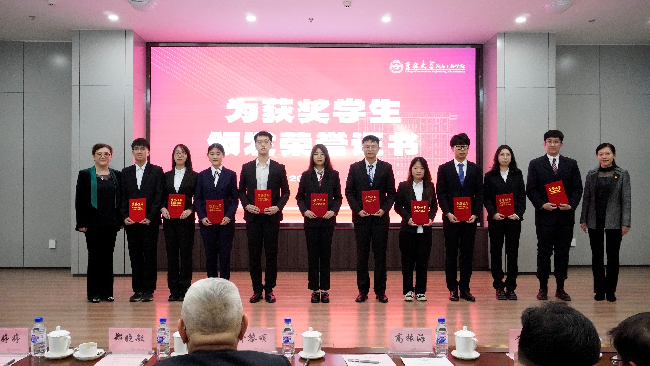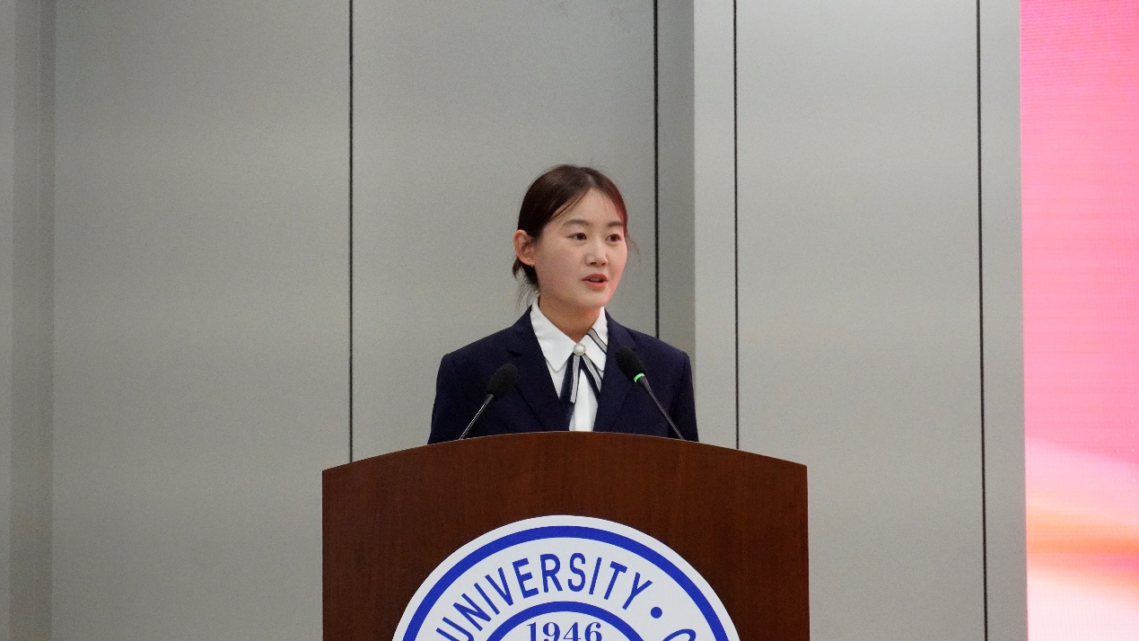 在校获奖员工代表2019级车辆工程专业张馨雨发言。她在发言中表达了对俞黎明先生无私帮助与支持的感谢,并表示未来将继续刻苦学习,努力提升个人能力,以实际行动回馈社会,不断为实现自己的“汽车梦”奋斗。