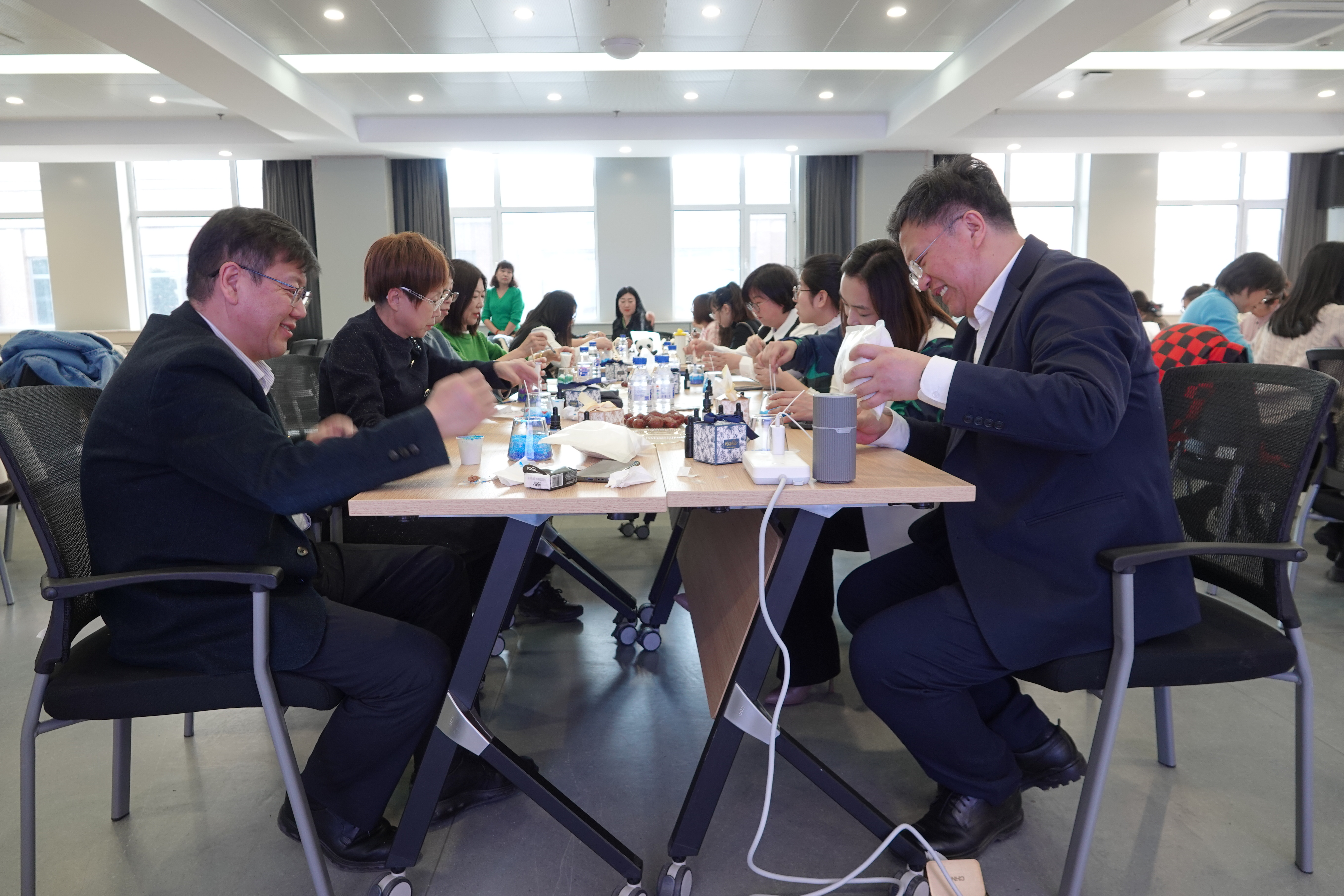 在芬芳舒适的氛围中,荣泽老师详细讲解了制作沙画精油蜡烛的操作要领,指导女教工们逐步进行烛芯固定、石蜡上色、精油融合,创意填装等步骤。引导女教工们发挥想象力,创作属于自己的沙画图案,制作独一无二的香薰蜡烛。老师们认真雕琢着自己的“作品”,最终,在大家的共同努力下,一个个色彩美丽、芬芳浓郁的沙画蜡烛展现在我们面前,芳香之余也为老师们的健康美好生活增添了一份浪漫。