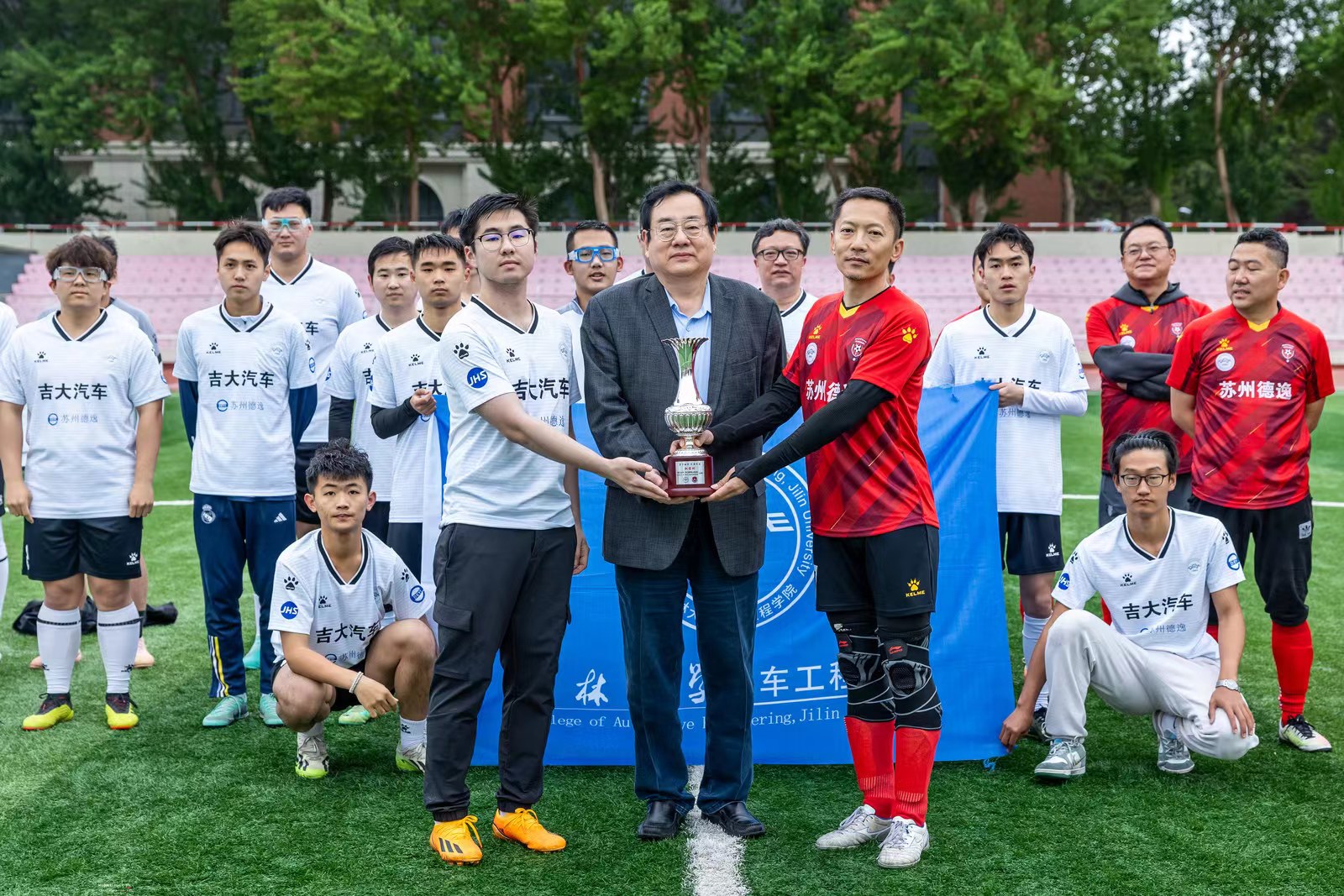 苏州德逸新能源汽车科技有限公司董事长、苏州金鸿顺汽车部件股份有限公司首席科学家林逸将凝结了汽院精神的“驭茵杯”奖杯授予双方球队队长,1996级员工、员工足球队队长杨佳音和师生足球队队长崔文骞共同接过奖杯,并合影留念。