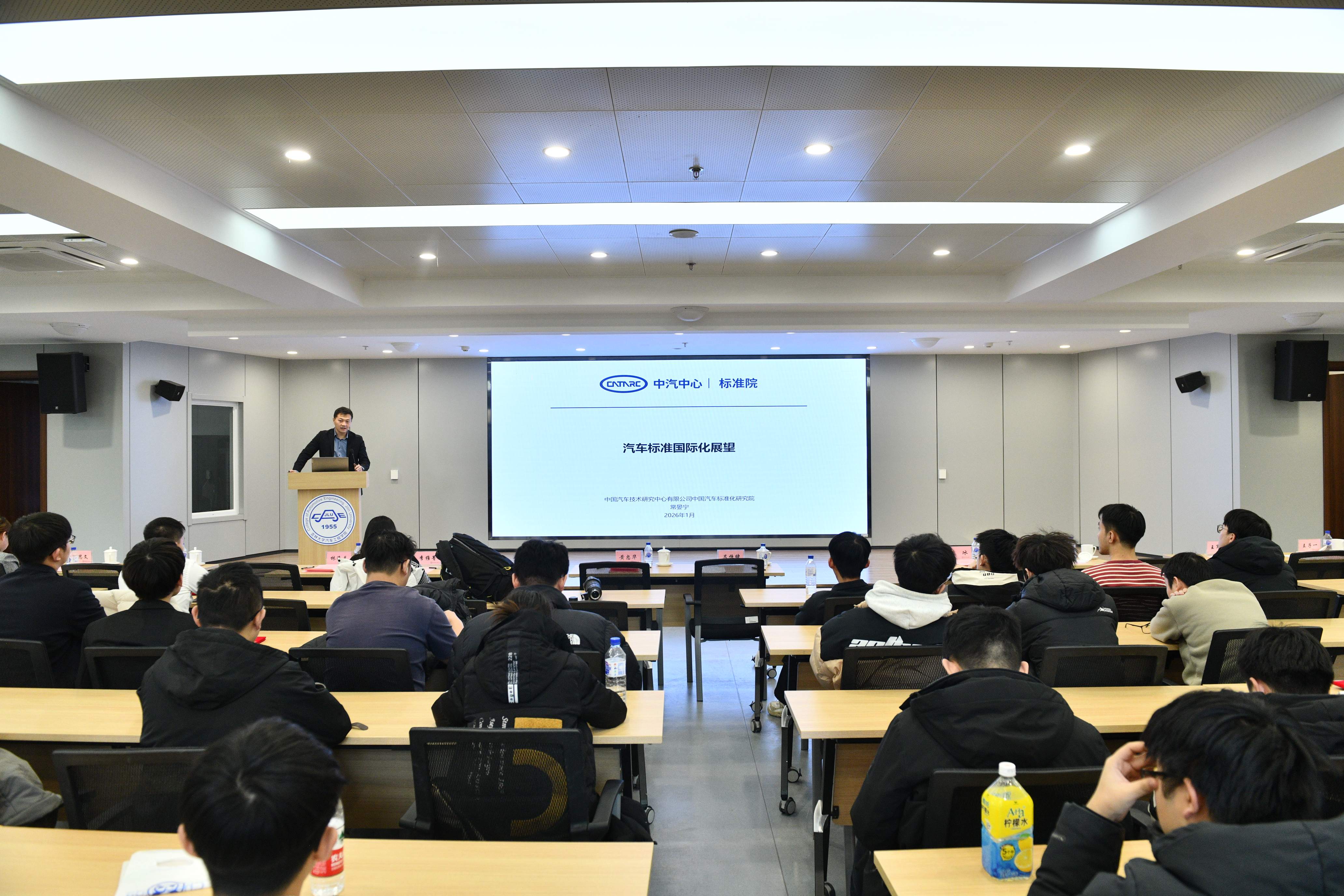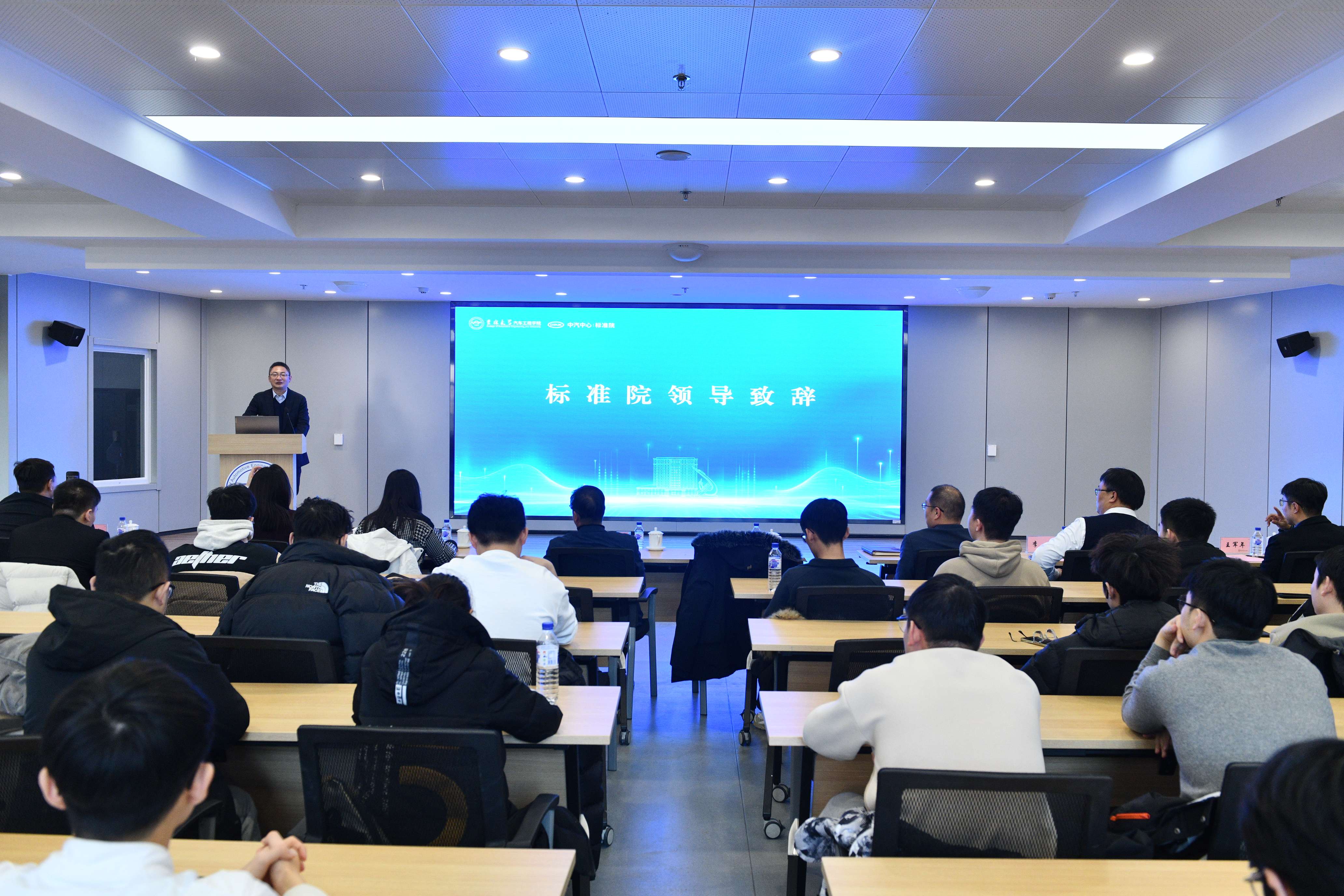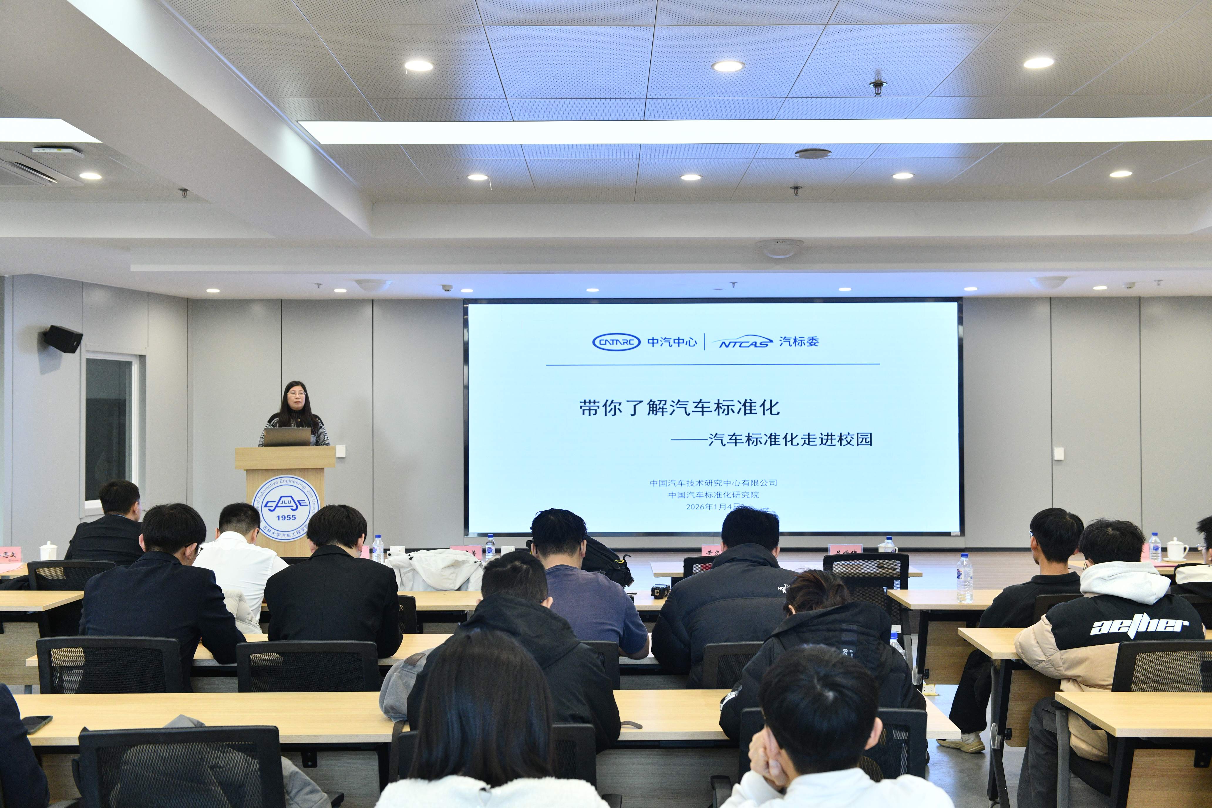 2026年1月4日,“汽车标准化走进吉大”主题活动在南岭校区汽车大楼214会议室举行。本次活动由韦德1946体育官方入口与中国汽车技术研究中心有限公司汽车标准化研究院(以下简称 “标准院”)联合主办,韦德1946体育官方入口汽车工程公司党委书记黄忠华、经理朱冰,标准院副经理吕恒绪、技术总监李维菁,校企双方领导、师生代表共同参与,公司党委副书记林海兰主持会议。