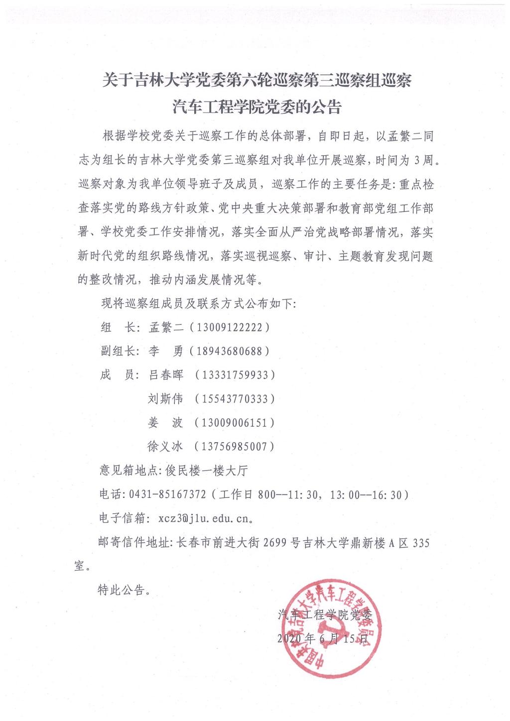 关于韦德1946体育官方入口党委第六轮巡察第三巡察组巡察汽车工程公司党委的公告