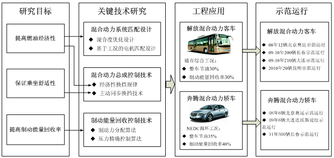 从“十五”期间率先开展了混合动力汽车构型匹配设计和动力总成集成控制的研究,形成了一系列具有自主知识产权的主导技术。总计承担或参与国家973、863、国际科技合作等重大计划研究课题10余项,承担省级计划项目10余项。研究成果获得发明专利20余项,发表研究论文200余篇,培养博士13人,积累了丰富的混合动力系统建模仿真、动力系统匹配与控制、能量管理策略、构型分析与优化、国内外典型混合动力构型测试评价等方面的研究基础,构建了混合动力汽车动力系统匹配设计仿真、动力总成控制系统试验测试、制动控制系统试验测试三个系统平台。研究成果在中国第一汽车集团公司得到推广,完成了解放牌混合动力客车的产品定型和认证。
