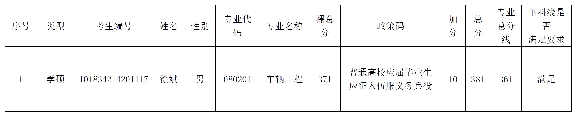 按照国家规定,经过国家初审,公司复审,考生徐斌符合“普通高校应届毕业生应征入伍服义务兵役”加分规定,初试总分加10分,现予以公示。