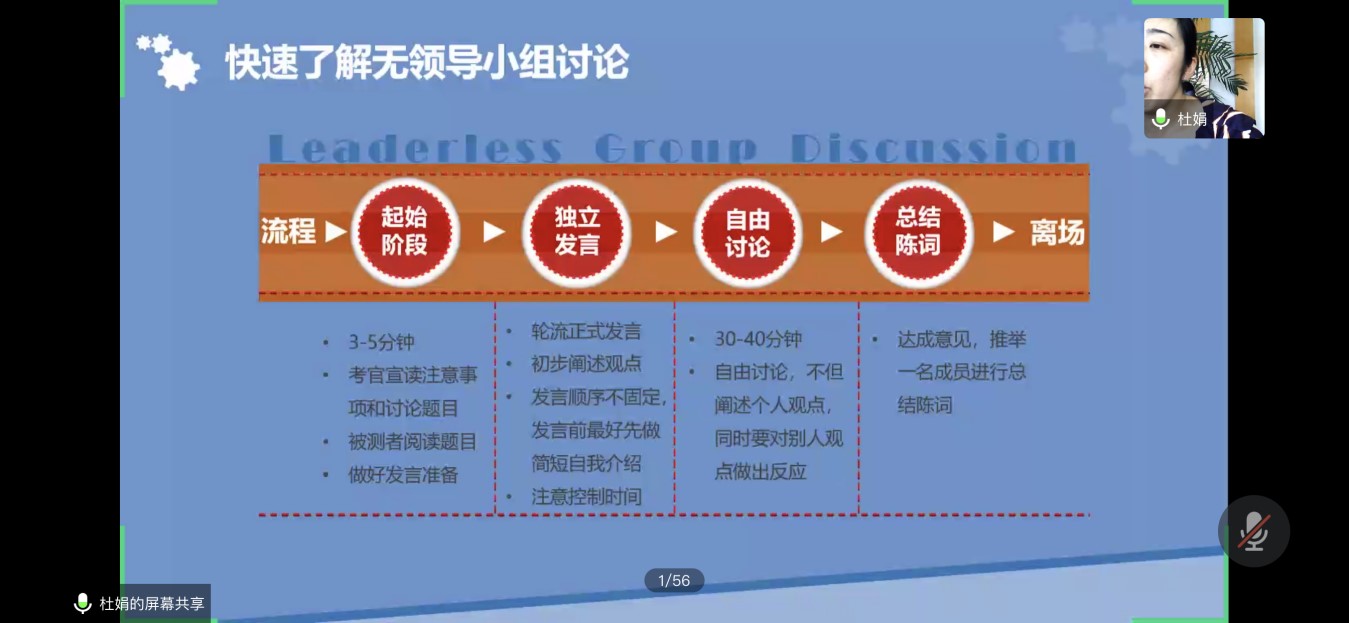此次活动采用线上形式进行,杜鹃女士首先讲述了无领导小组讨论在当今就业面试的重要性以及无领导小组讨论的各种形式及适用范围。她指出,无领导小组会议是现在企业选拔具有领导能力人才的最主要方式,了解和掌握无领导小组会议对于面试至关重要。接着,杜娟女士又通过实例讲解了无领导小组会议的流程,说“无领导小组会议的题型是比较固定的,其流程也相对固定,可分为起始阶段、独立发言、自由讨论、总结陈词、最后离场五个过程。同学们需要紧紧把握无领导小组面试的流程。”随后,她给同学们讲解了参加无领导小组讨论的技巧,帮助同学们在把握时机,引导讨论方向,保证角色分工明确,找准自己的定位等多个方面提升自己的能力。