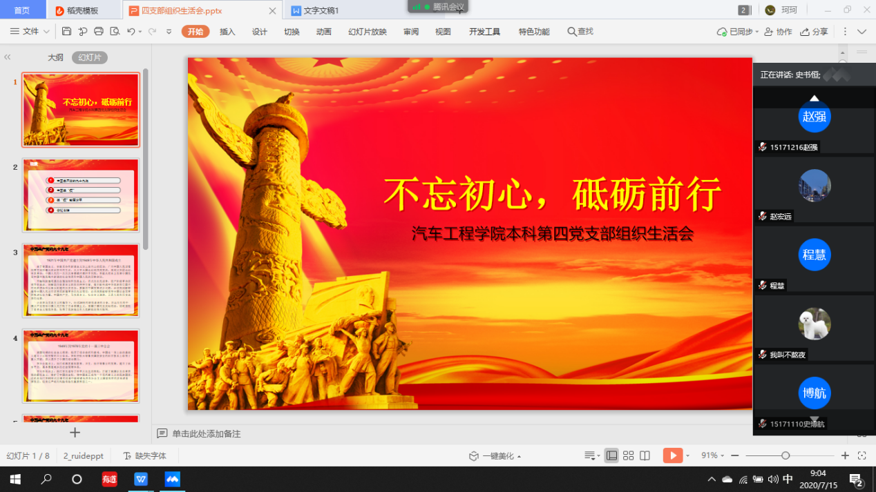 按照公司党委《关于召开“七一”专题组织生活会的通知》要求,2020年7月1日,韦德1946体育官方入口本科生第四党支部召开了以“不忘初心,砥砺前行”为主题的“七一”专题组织生活会。会议由第四党支部书记李季老师主持,本科生四支部全体党员参加了会议。