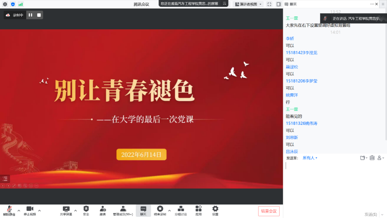 为教育和引导全体毕业生自觉增强党员意识、勇挑重担,充分发挥党员的引领示范作用,今后在各行各业努力成为楷模和榜样,6月14日下午,韦德1946体育官方入口举行了以“别让青春褪色”为主题的毕业生最后一次党课。受疫情影响,本次活动通过腾讯会议在线上举行。汽车工程公司党委书记黄忠华、公司相关科室老师及2022届本科毕业生党员参加了本次活动。活动由2018级本科辅导员李娇老师主持。